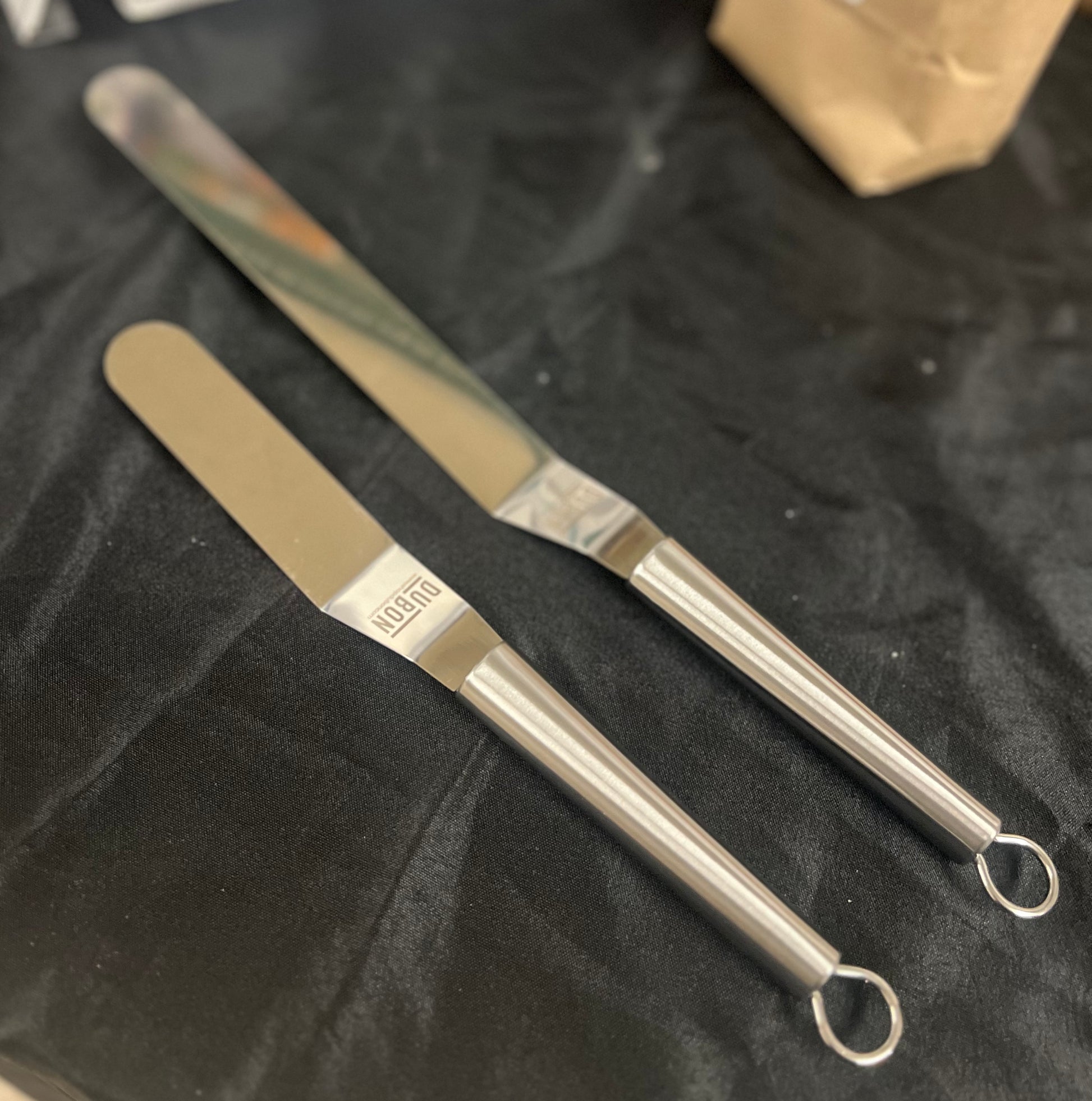 Handy-dandy offset spatulas, two sizes, with wide blades, sturdy metal handles and a convenient hanging hook.